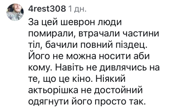 «За цей шеврон люди гинули, втрачали частини тіла», – поділилися вони своєю думкою. «Його не повинен носити хто завгодно. Навіть якщо це фільм. Жоден актор не гідний носити його просто так».