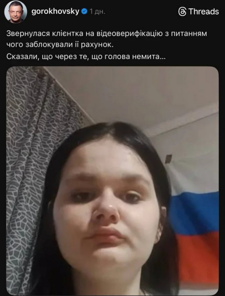 Зокрема, Олег Гороховський розмістив у соцмережі Threads фотографію клієнтки під час здійснення відеоідентифікації з-за кордону. На задньому тлі фото на стіні був розміщений прапор, який Олег Гороховський ідентифікував як російський, і відмовив дівчині в наданні фінансових послуг через “немиту голову”.