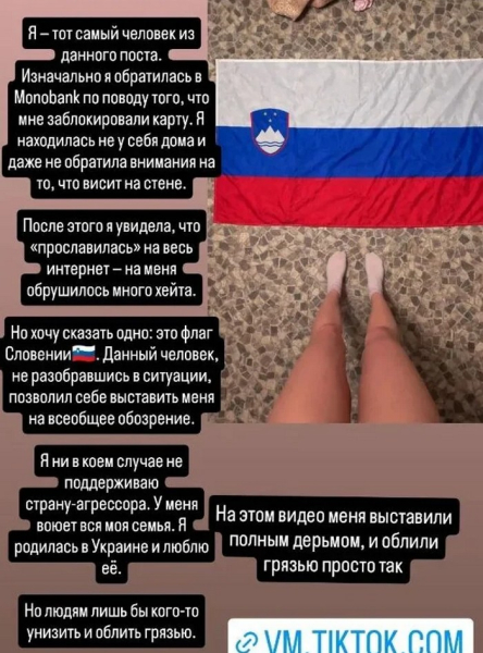 Проте сама дівчина згодом заявила, що вона дотримується проукраїнських переконань, її батько бере участь у бойових діях у лавах ЗСУ. При цьому з 2023 року вона перебуває за кордоном, а в момент проведення відеоідентифікації перебувала в гостях у подруги, у якої на стіні розміщено прапор Словенії. Справді, прапор Словенії має ідентичну кольорову гаму з російським, і єдина їхня відмінність – герб у лівій частині полотна на прапорі Словенії. Однак самого герба на фотографії не видно, оскільки частина полотна, де він повинен бути, закрита головою клієнтки.
