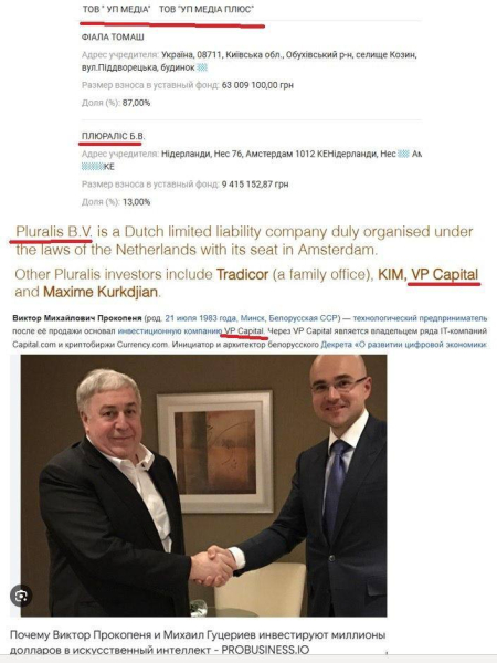 «Російський бізнесмен Гуцерієв — співвласник УП. 31 січня власником 13% у ТОВ „УП МЕДІА ПЛЮС“ і „УП МЕДІА“ стала компанія Pluralis BV, офіційним інвестором якої є фірма VP Capital (Лондон), власником якої є білоруський мультимільйонер Віктор Михайлович Прокопеня (1983 р.н., Мінськ). Головним партнером Прокопені є Саїд Гуцерієв (1988), син російського мільярдера Мікаїла Гуцерієва (БІНбанк, Руснафта, Ельдорадо), близький до Лукашенка», — констатував він.