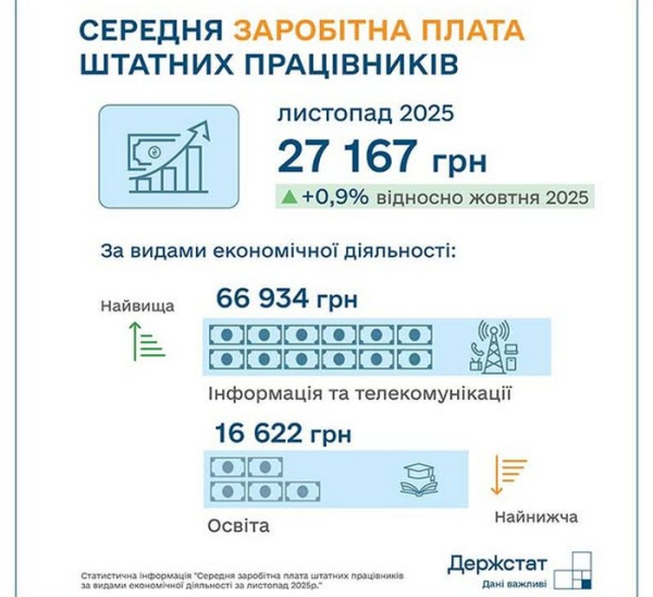 В цілому, середня заробітна плата по Україні за результатами листопада 2025 року становила 27 167 грн, що на 0,9% більше у порівнянні з жовтнем 2025 р. Найбільше оплачують працю в галузі інформації та телекомунікацій — 66 934 грн, а найменше в освітній сфері — 16 622 грн.