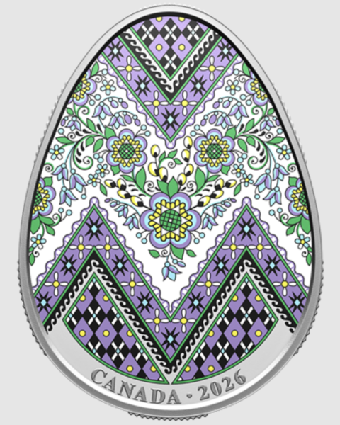 Канада випустила срібну монету у формі української писанки Фото 06.03.2026 20:59 Укрінформ Канадський королівський монетний двір здійснив випуск кольорової срібної монети у вигляді української писанки.