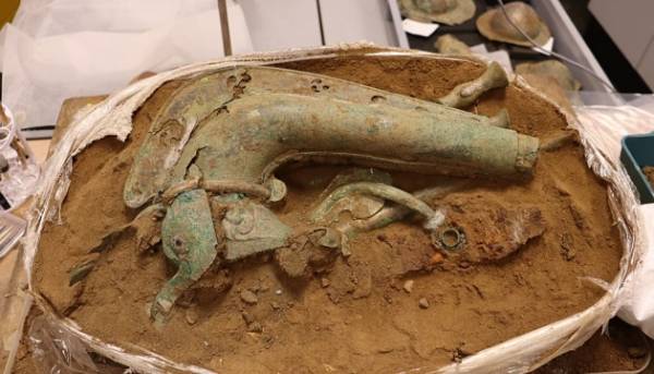 Серед виявлених артефактів також бронзова голова вепра, яка колись була частиною військового прапора, п’ять умбонів (накладок на щити) і залізний предмет незрозумілого походження.
