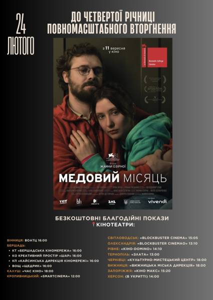 Сьогодні у ряді міст відбудуться безкоштовні перегляди українського трилера «Медовий місяць» 24.02.2026 02:30 Укрінформ У ряді населених пунктів України 24 лютого відбудуться безкоштовні доброчинні сеанси романтичного трилера режисерки Жанни Озірної «Медовий місяць».