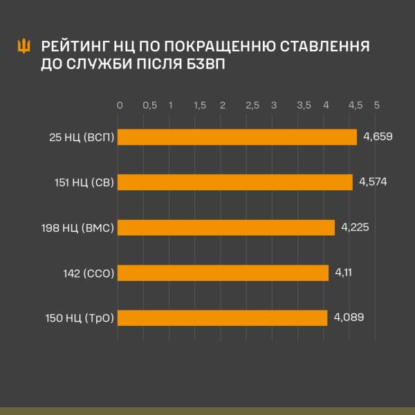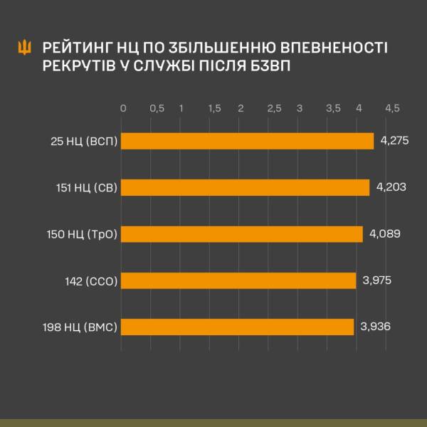 Разом з тим, анкетування визначило кращі тренувальні центри в усіх Силах оборони. До першої п’ятірки увійшли: 151-й НЦ (Сухопутні війська), 25-й НЦ (Військова служба правопорядку), 150-й НЦ (Територіальна оборона), 142-й НЦ (Сили спеціальних операцій), 198-й НЦ (Військово-морські сили).