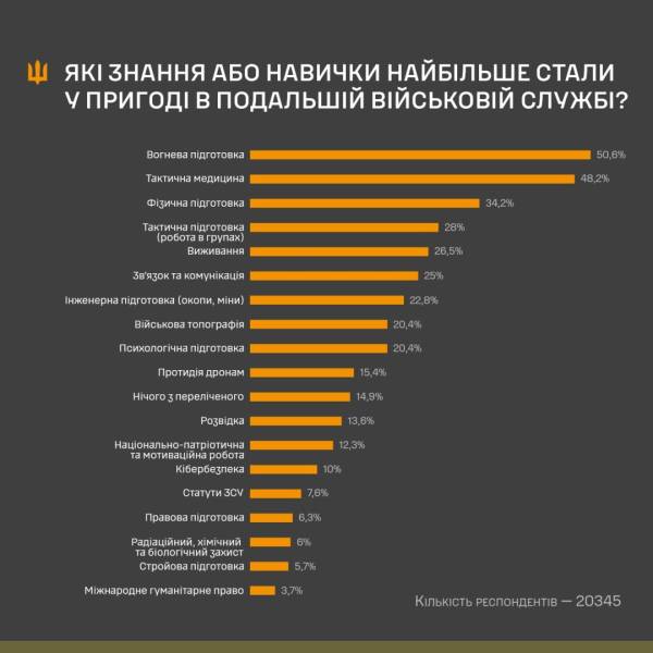 «Опитування засвідчило, що орієнтовно 45% опитаних задоволені досвідом отримання початкової загальновійськової підготовки. 30% задоволені частково. Близько 13% скоріше не задоволені та майже 10% – зовсім не задоволені. Трохи більше ніж 2% опитаних не змогли відповісти на запитання», – зазначено в повідомленні.