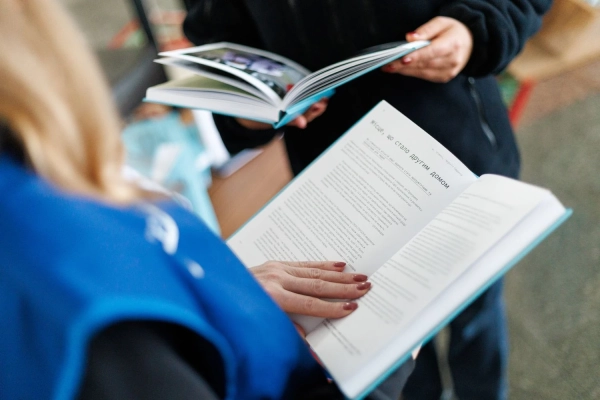 На Центральному залізничному вокзалі Києва відкрилася виставка «Читальня однієї книги», присвячена виданню «Люди на своєму місці». Збірка описує 60 історій українських чоловіків та жінок, які зберігають свою людяність попри виклики війни.