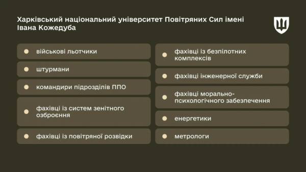 Харківський національний університет Повітряних сил імені Івана Кожедуба здійснює вишкіл військових льотчиків, штурманів, командирів підрозділів ППО, спеціалістів із систем зенітного озброєння, повітряної розвідки, безпілотних авіаційних комплексів, інженерно-технічної служби, морально-психологічного супроводу, а також енергетиків і метрологів.