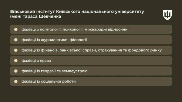 Військовий інститут Київського національного університету імені Тараса Шевченка проводить підготовку професіоналів з повною вищою освітою за спеціальностями політологія, психологія, міжнародні відносини, журналістика, філологія, фінанси, банківська справа, страхування та фондовий ринок, правознавство, геодезія та землеустрій, соціальна робота.