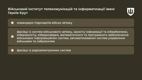 Військовий інститут телекомунікацій та інформатизації імені Героїв Крут готує командирів підрозділів військ зв’язку, спеціалістів із систем військового зв’язку, захисту інформації та кібербезпеки, кіберзахисту, кіберрозвідки, математичного та програмного забезпечення військових інформаційних систем, автоматизованих систем управління військами та озброєнням, а також фахівців з радіоелектронних систем.