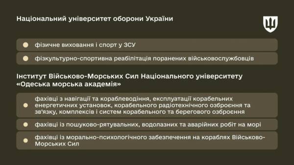 Так, Національний університет оборони України забезпечує підготовку офіцерів, котрі займатимуть посади з фізичного виховання і спорту у Збройних силах України. Торік тут уперше розпочали навчання фахівців з фізкультурно-спортивної реабілітації травмованих військовослужбовців.
