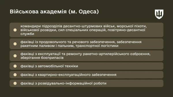 Військова академія (м. Одеса) здійснює вишкіл командирів підрозділів десантно-штурмових військ, морської піхоти, військової розвідки, сил спеціальних операцій, а також фахівців з повітряно-десантної справи, продовольчого та речового забезпечення, забезпечення пальним та мастильними матеріалами, транспортної логістики, експлуатації та обслуговування ракетно-артилерійського озброєння, зберігання боєприпасів, автотехніки та квартирно-експлуатаційного забезпечення. Також академія готує фахівців із розвідувально-інформаційної діяльності.