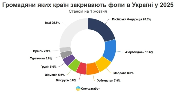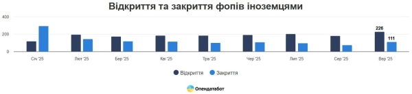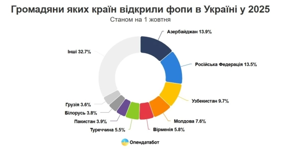 За перші дев'ять місяців 2025 року іноземці зареєстрували в Україні 1648 фізичних осіб-підприємців. Найактивнішими були громадяни Азербайджану, Росії та Узбекистану, причому найчастіше припиняли свою діяльність росіяни.