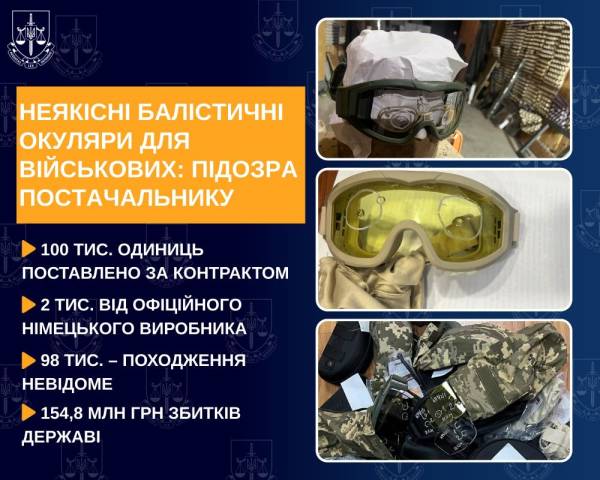 Браковані балістичні окуляри для ЗСУ: постачальнику оголосили підозру, збитки – майже 155 мільйонів Фото 18.02.2026 10:16 Укрінформ Представники правоохоронних органів повідомили про підозру директору приватної фірми за постачання Міністерству оборони невідповідних стандартам балістичних окулярів-масок для військовослужбовців на 154,8 млн грн.