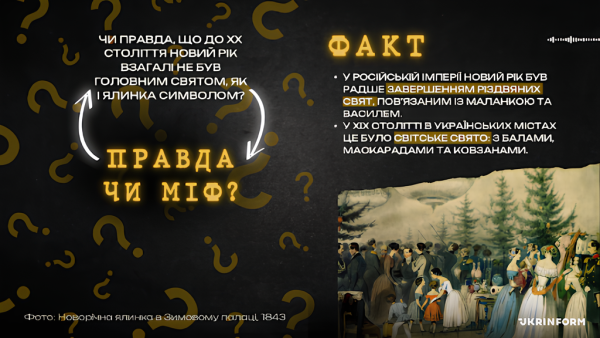 Ось коментар істориків УІНП: Протягом тривалого часу в російській імперії, до складу якої входила значна частина українських земель, Новий рік був завершенням різдвяних свят. Слід також враховувати, що Новий рік за юліанським календарем припадає на два церковні свята: 31 грудня встановлене свято на честь Меланії, а 1 січня – це свято на честь Василія Великого. У ХІХ ст. святкування Нового року в містах було світським: бали, маскаради, лотереї, катання на ковзанах.