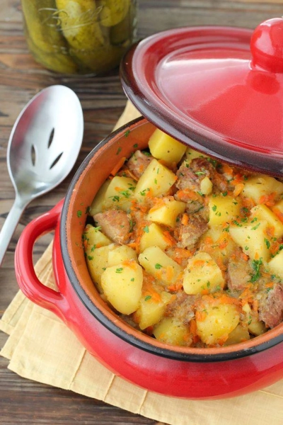 Перекладіть все в казан або глибоку каструлю. Додайте нарізану картоплю. Залийте водою або бульйоном так, щоб рідина покривала продукти. Приправте сіллю, перцем і додайте лавровий лист. Доведіть до кипіння. Зменште вогонь і тушкуйте під кришкою 30-40 хвилин, доки картопля не стане м’якою. Перед подачею посипте свіжою зеленню.