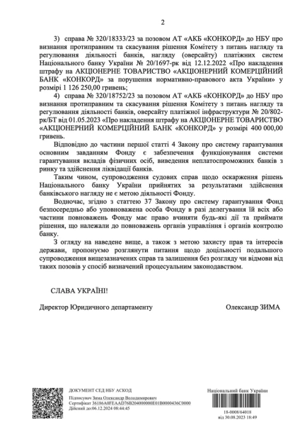 Ще цікавіше те, що проти Зими було відкрито кримінальне провадження за службове правопорушення. Державне бюро розслідувань порушило кримінальну справу проти головного юриста НБУ наприкінці 2023 року за ймовірним зловживанням владою або службовим становищем, що призвело до тяжких наслідків. Зима, який також є головою адміністративної ради Фонду гарантування вкладів фізичних осіб, втрутився у судовий процес, надіславши листа від імені Національного банку України до Фонду. У листі він «рекомендував» відкликати позови, подані проти Національного банку. Варто зазначити, що головний юрист регулятора просив відкликати позови, подані Конкорд Банком, до початку процесу його ліквідації. Позивач планував оскаржити в суді штрафи у розмірі майже 63,5 мільйона гривень, накладені регулятором.