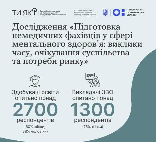 Про це оголосила у Телеграм перша леді Олена Зеленська, представляючи аналіз «Підготовка немедичних спеціалістів у царині ментального здоров’я: виклики сьогодення, сподівання соціуму та потреби ринку», здійснений в рамках програми «Ти як?», інформує Укрінформ.
