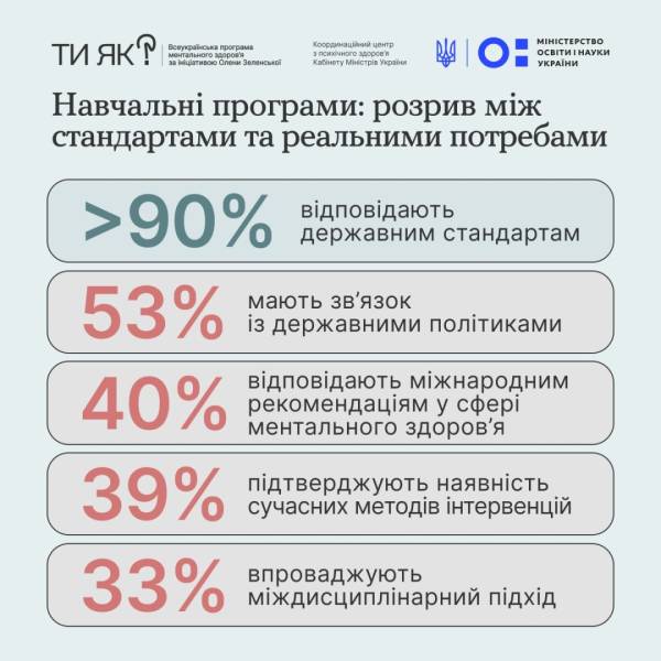 Дружина Президента також зауважила, що освітні програми у цій сфері не завжди відповідають потребам практики: лише 40% зорієнтовані на міжнародні рекомендації; 39% містять сучасні методи роботи; 33% застосовують міждисциплінарний підхід.