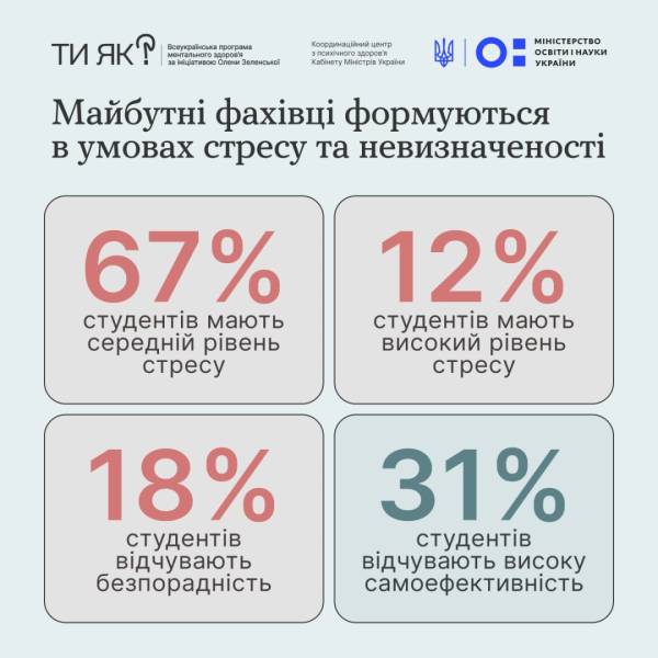Водночас вона підкреслила, що майбутні спеціалісти навчаються в умовах напруження: 67% мають середній рівень напруги, 12% – високий. Лише третина впевнена у власній професійній компетентності.