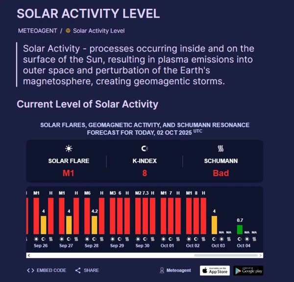 Україна перебуває під впливом дуже сильної магнітної бурі магнітудою 7 балів. Очікується, що вона ослабне 2-3 жовтня, але її сила може посилюватися.