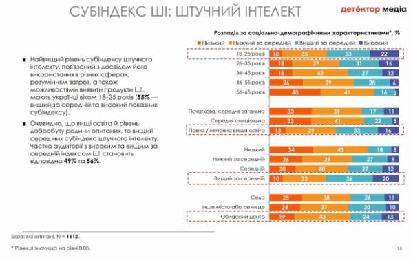 Кандидат соціологічних наук, доцент, провідний науковий співробітник Інституту соціології НАН України Марта Наумова підкреслила, що найактивнішими користувачами штучного інтелекту є група людей віком 18-35 років, з вищою освітою та досить високим рівнем матеріального забезпечення.