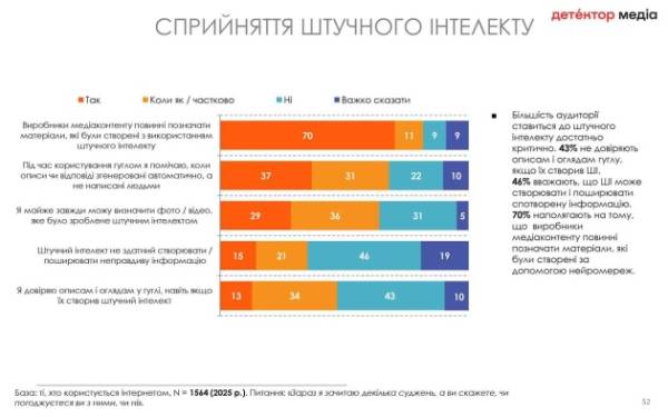 "З тим, що творці медійного контенту повинні маркувати матеріали, які зроблені з використанням штучного інтелекту, згоджується 70% нашої аудиторії. Лише 37% помічають, коли Google показує під час пошуку певні матеріали, що згенеровані автоматично. 29% майже завжди можуть розрізнити, де фото чи відео зроблене штучним інтелектом, а де ні. І тільки 15% вважають, що штучний інтелект не може створювати та розповсюджувати неправдиву інформацію", – повідомила Наумова.
