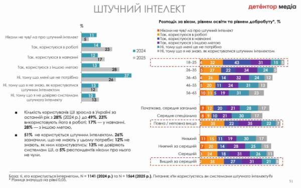"Число користувачів ШІ збільшилося в Україні за минулий рік з 28% (2024 рік) до 49%. 23% застосовують його в діяльності, 17% – у навчанні, 28% – для інших цілей. 51% не використовує штучний інтелект", – зазначено у дослідженні.