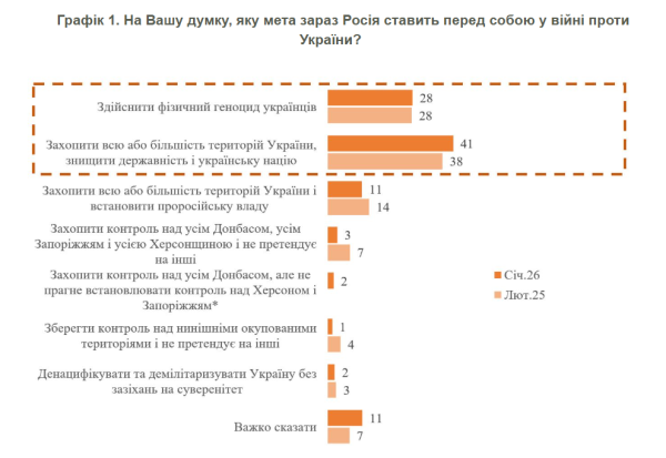 Водночас є 2% респондентів (майже стільки ж було раніше), які вважають, що Росія просто має на меті “денацифікувати" та «демілітаризувати" Україну без посягань на суверенітет.