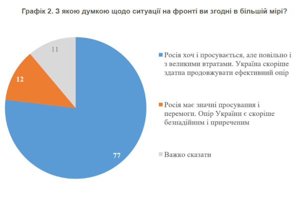 Дослідження виявило, що дотримуються більш скептичного погляду, згідно з яким Росія демонструє суттєві успіхи та досягнення, а опір України є марним – 12%. Ще 11% не змогли сформулювати власну точку зору.