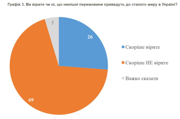 Опитування засвідчило, що 69% не вірять, що поточні переговори призведуть до тривалого миру і здебільшого українці обґрунтовували це небажанням самої Росії домовлятися про мир та її прагненням продовжувати війну проти України. Лише 26% покладають надії на те, що перемовини закінчаться стабільним миром. Ще 5% не змогли визначитися з відповіддю.