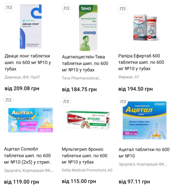 Найбільш разюча різниця зафіксована в сегменті шипучих таблеток для розрідження мокротиння. Наприклад, «Дваце Лонг» від «Дарниці» має цінник 209,08 гривень за 10 таблеток. Тим часом інший аналог «таблетки Ацетал» від «Здоров'я» коштує лише 97,11 гривень. Різниця становить понад 111 гривень за упаковку.
