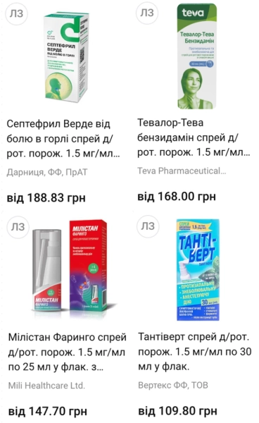 Схожа ситуація і зі спреями для горла – якщо «Септефрил Верде» від «Дарниці» продається за 188,83 грн, то «Тантиверт Спрей» від «Вертекс ФФ» коштуватиме вам 109,80 грн. Тут ви економите понад 79 грн на одному флаконі.