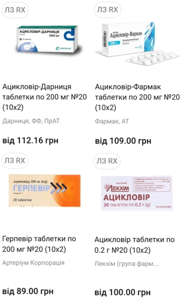 А якщо навіть враховувати противірусні препарати – «Ацикловір-Дарниця» коштує 112,16 грн, а повний аналог «Герпевір» від «Артеріума» – 89,00 грн. Економія – 23,16 грн.