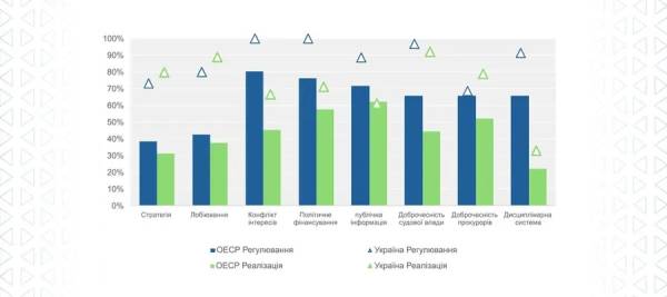 У реалізації регуляторних (80%) та імплементаційних (89%) критеріїв у сфері лобіювання Україна є одним із лідерів нарівні з Канадою, Францією та Естонією. Українське законодавство, на відміну від більшості країн-членів та держав-партнерів ОЕСР, передбачає прозорість інформації про бенефіціарних власників, санкції за порушення правил лобістської діяльності, а Реєстр прозорості містить найповніший набір даних про суб’єктів лобіювання, їх діяльність і витрати (схожа ситуація лише в Румунії).