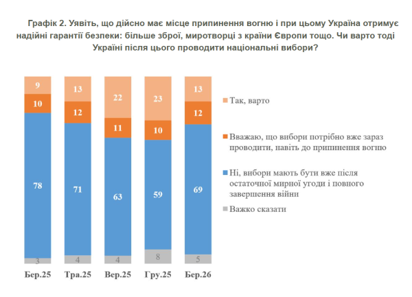 За інформацією соціологів, натомість з грудня 2025 року до березня 2026 року з 59% до 69% зросла кількість тих, хто дотримується погляду, що вибори мають відбутися тільки після остаточної мирної угоди та повного завершення війни.