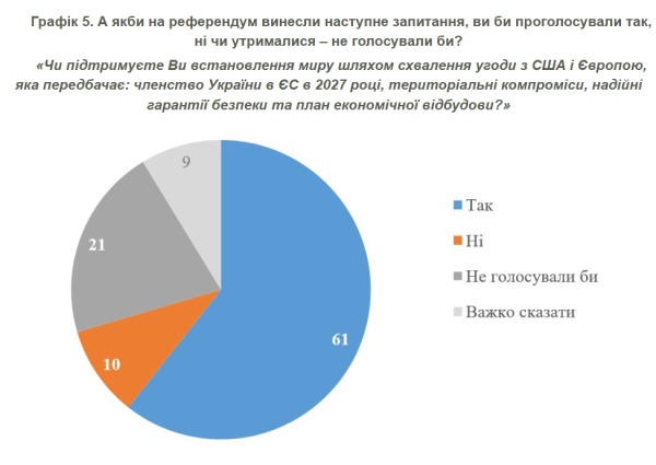 В той же час на питання в іншому формулюванні – «Чи підтримуєте Ви встановлення миру шляхом схвалення угоди з США та Європою, яка передбачає: членство України в ЄС у 2027 році, територіальні компроміси, надійні гарантії безпеки та план економічної відбудови?» – позитивно відповіли вже 61% опитаних, 10% негативно, 21% не голосував би.