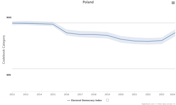 Чтобы более конкретно понять, как выглядит разворот, полезно взглянуть на недавнюю историю Польши. Когда-то считавшаяся одной из сильнейших посткоммунистических демократий, праворадикальная партия «ПиС», избранная в 2015 году, превратила общественный телеканал страны в пропагандистский центр и наполнила судебную систему своими приближенными. Но в 2023 году коалиция оппозиционных партий победила «ПиС» на выборах в национальный парламент и начала попытки исправить ситуацию. В рейтинге Польши по версии V-Dem можно увидеть характерную U-образную кривую — спад при «ПиС» и рост после поражения.