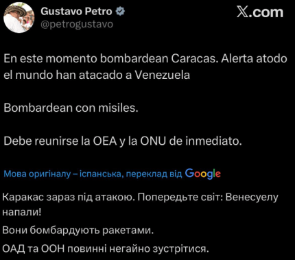Каракас зараз під ударом. Сповістіть світ: Венесуела зазнала нападу. Їх обстрілюють ракетами. ОАД (Організація Американських Держав — ред.) та ООН повинні терміново зібратися, — зазначив у своїй офіційній заяві президент Колумбії Густаво Петро.