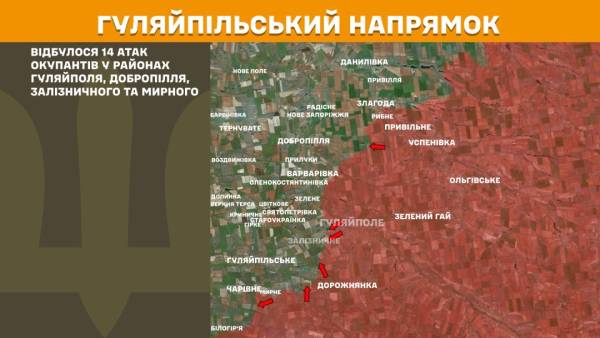 На Гуляйпільському напрямку відбулося 14 російських атак у районах Гуляйполя, Добропілля, Залізничного та Мирного.