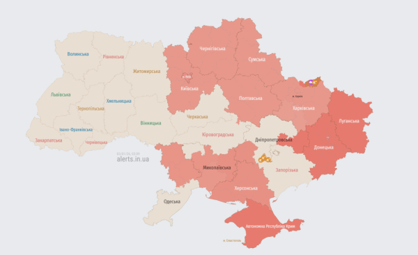 Поточна мапа повітряних тривог по Україні станом на 03:09 / Джерело: https://alerts.in.ua/