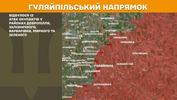 На Гуляйпільському напрямку відбулося 12 атак окупантів в районах Добропілля, Залізничного, Варварівки, Мирного та Зеленого.