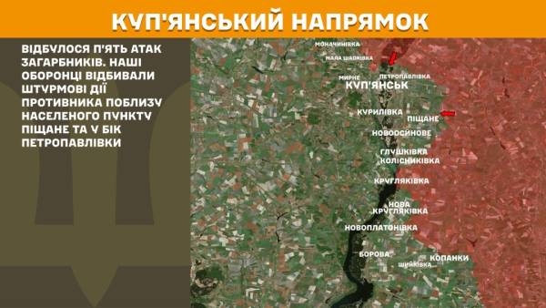 На Куп’янському напрямку сталося п’ять ворожих наступів. Сили оборони стримували штурмові дії біля Піщаного та в напрямку Петропавлівки.
