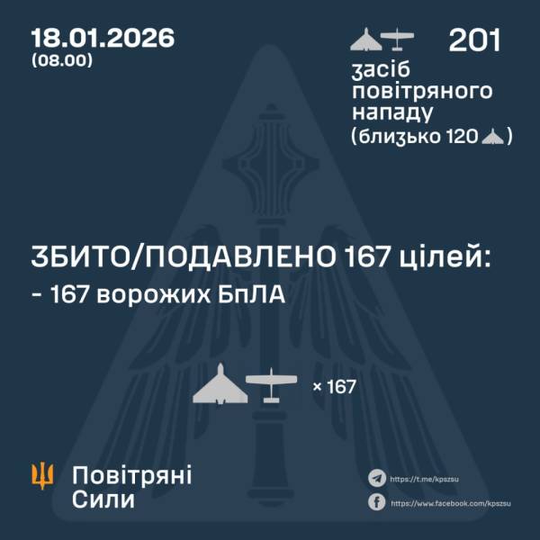 ППО з вечора знешкодила 167 дронів 18.01.2026 08:15 Укрінформ Системи протиповітряної оборони нейтралізували 167 безпілотних літальних апаратів, за допомогою яких російські війська атакували Україну з вечора суботи, на 15 ділянках зафіксовано попадання ворожих об’єктів.