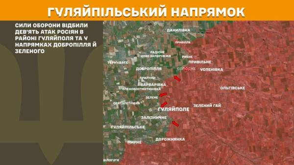 На Гуляйпільському напрямку Сили оборони відбили дев’ять атак росіян в районі Гуляйполя та у напрямках Добропілля й Зеленого.