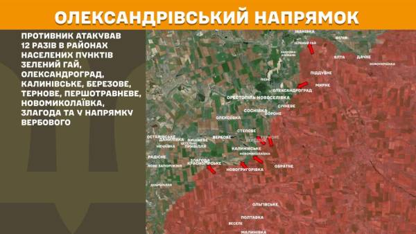 На Олександрівському напрямку ворог атакував 12 разів у районах населених пунктів Зелений Гай, Олександроград, Калинівське, Березове, Тернове, Першотравневе, Новомиколаївка, Злагода та у напрямку Вербового.