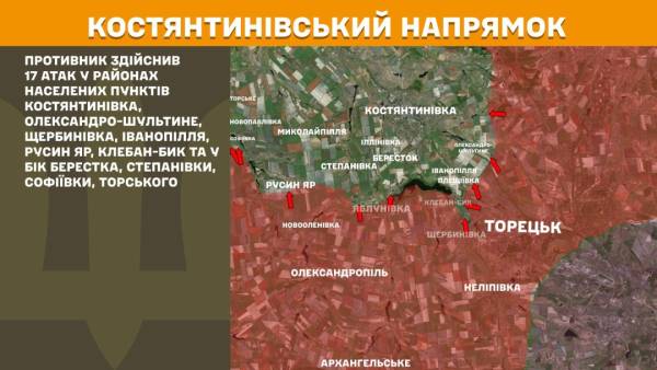 На Костянтинівському напрямку окупанти здійснили 17 атак у районах Костянтинівки, Олександро-Шультиного, Щербинівки, Іванопілля, Русиного Яру, Клебан-Бика та в напрямку Берестка, Степанівки, Софіївки і Торського.