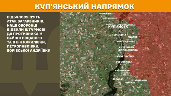 На Куп’янському напрямку зафіксовано п’ять атак. Сили оборони відбили наступальні дії росіян поблизу Піщаного та в напрямку Курилівки, Петропавлівки, Борівської Андріївки.