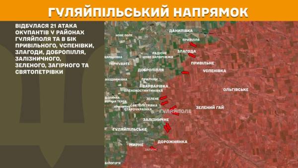 На Гуляйпільському напрямку відбулася 21 російська атака в районах Гуляйполя та в напрямку Привільного, Успенівки, Злагоди, Добропілля, Залізничного, Зеленого, Загірного і Святопетрівки.