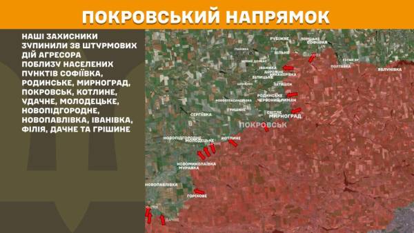На Покровському напрямку Сили оборони відбили 38 штурмових дій російської армії поблизу Софіївки, Родинського, Мирнограда, Покровська, Котлиного, Удачного, Молодецького, Новопідгородного, Новопавлівки, Іванівки, Філії, Дачного та Грішиного.